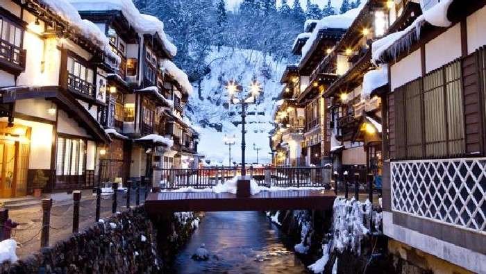 El balneario de aguas termales Ginzan Onsen ocupa el emplazamiento de una antigua mina de plata que se remonta al siglo XV en el entorno rural de Yamagata. Las posadas tradicionales o ryokan que bordean el río ofrecen pintorescas estampas lejos del bullicio de la gran ciudad. De hecho, la cadena de televisión norteamericana CNN calificó este lugar como «el pueblo de invierno con más encanto de Japón». Recorrido virtual