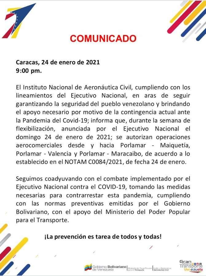 El Instituto Nacional de Aeronáutica Civil (INAC), autorizó operaciones aerocomerciales en la ruta Porlamar- Maiquetía, Porlamar – Valencia y Porlamar -Maracaibo durante esta semana de flexibilización.