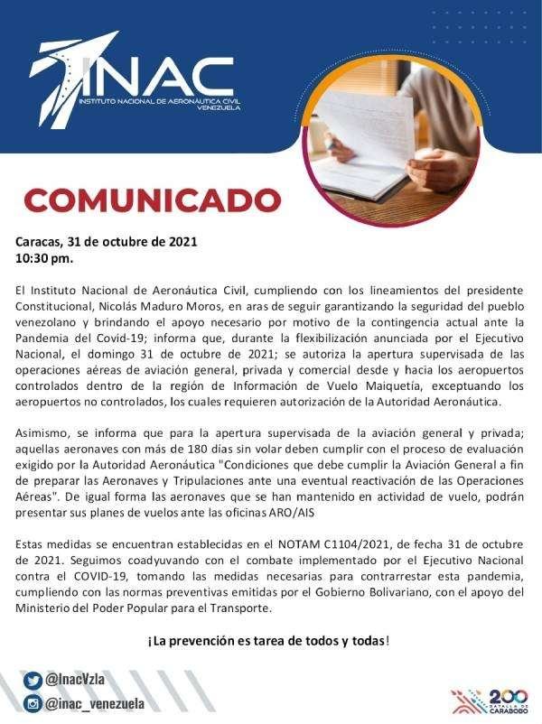 El Instituto Nacional de Aeronáutica Civil (INAC), informó que los aviones que tienen más de 180 días sin volar, deberán cumplir con el proceso de evaluación exigido por las autoridades aeronáuticas, mientras que las que han estado activas en sus operaciones, solamente deberán presentar un plan de vuelo.