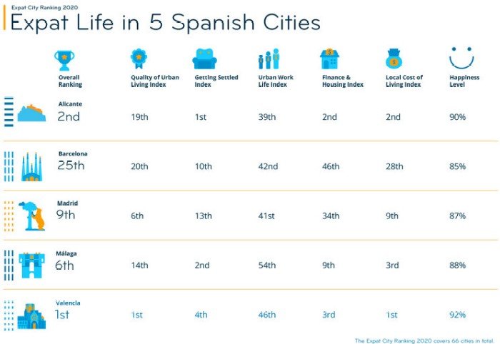 Cuatro de las 10 mejores ciudades del mundo para vivir son españolas. Palabra de expatriado. El Expat City Ranking, uno de los estudios más extensos en el mundo sobre vivir y trabajar en el extranjero, ha dado a conocer sus resultados que este 2020 sitúan a Valencia en primer lugar, a Alicante en segundo, a Málaga en el sexto y a Madrid en el noveno.