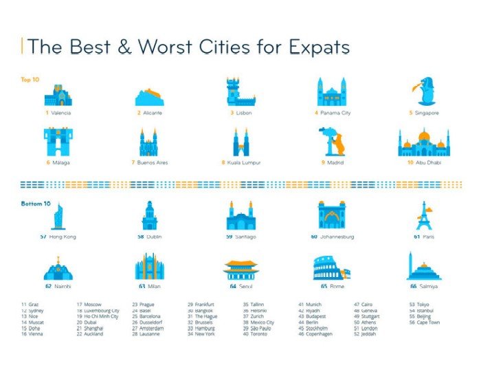 Además de las cuatro ciudades españolas mencionadas, completan este TOP 10 Lisboa, Ciudad de Panamá, Singapur, Buenos Aires, Kuala Lumpur y Abu Dhabi. En el otro lado de la clasificación, donde se encuentran las urbes menos atractivas para los expatriados, encontramos Hong Kong (57), Dublín (58), Santiago de Chile (59), Johannesburgo (60), París (61), Nairobi (62), Milán (63), Seúl (64), Roma (65) y Kuwait (66).