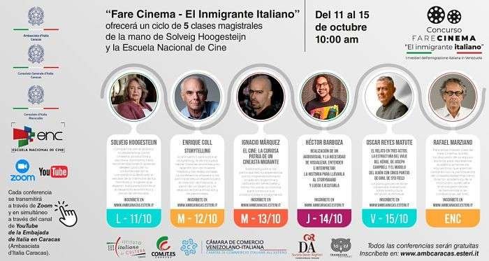 El Concurso Audiovisual “Fare Cinema – El inmigrante italiano” ofrece, del 11 al 15 de octubre, un ciclo de clases magistrales gratuitas en alianza con la Escuela Nacional de Cine (ENC), asociación sin fines de lucro fundada en 2009 para ofrecer formación integral en todas las áreas de la realización cinematográfica. Las conferencias se transmiten por internet, con la participación de ponentes de destacada trayectoria en el ámbito cinematográfico nacional para brindar consejos y herramientas a los hacedores audiovisuales y aspirantes a participar en el certamen de cortometrajes.